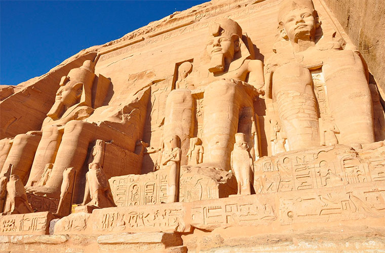 Immerso nel silenzio del deserto nubiano, sulle rive calme del Lago Nasser, Abu Simbel appare all’improvviso, immenso, fuori dal tempo. Le sue quattro statue colossali di Ramses II, alte venti metri, scolpite direttamente nella montagna, dominano il paesaggio con uno sguardo solenne. I lineamenti del faraone sono ovunque, ripetuti con orgoglio: è lui il dio vivente, colui che ha voluto questo tempio come messaggio eterno al mondo e ai popoli del sud. All’interno, le pareti raccontano la Battaglia di Qadesh, la più celebre del suo regno, in cui Ramses si autoproclama vincitore assoluto contro gli Ittiti, anche se la guerra finì in parità. È uno dei primi esempi di propaganda monumentale della storia.