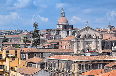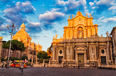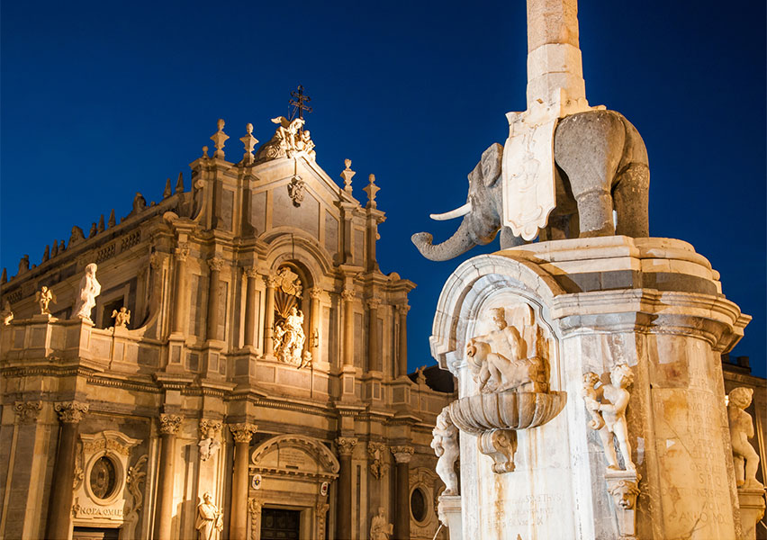 Trasferimento condiviso presso l’aeroporto di partenza. Check-in e imbarco su volo per Catania. All’arrivo trasferimento in hotel. In base all’orario di arrivo sarà possibile effettuare un’escursione facoltativa, il walking tour guidato di Catania (€ 85 per persona, prenotazione obbligatoria) per ammirarne lo splendido centro storico con la Piazza Duomo, la Statua dell’Elefante, la Cattedrale, la via Etnea e la barocca via dei Crociferi, l’anfiteatro romano, e concludere con una cena a base del tradizionale “street food” nel cuore della pescheria. Cena libera. Pernottamento.