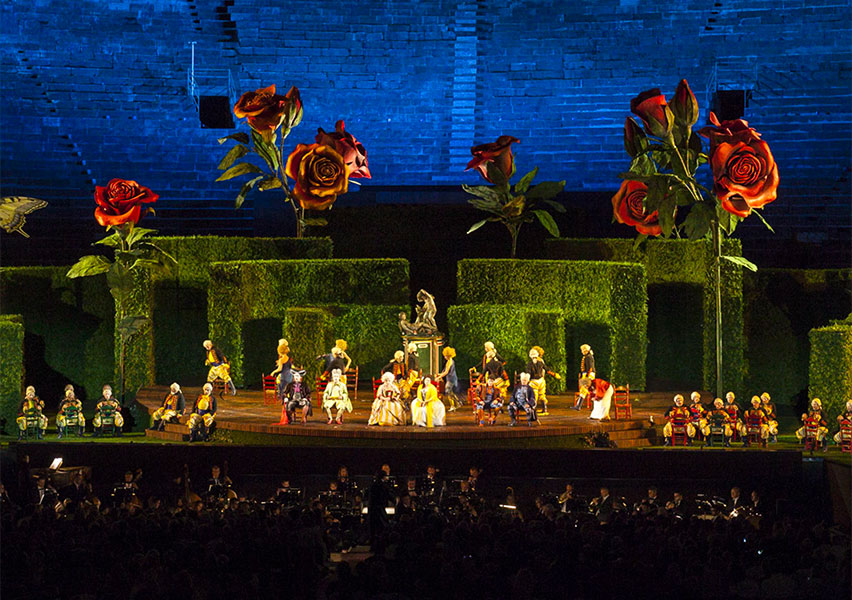 «Largo al factotum della città» e all’opera buffa per eccellenza: Il Barbiere di Siviglia di Gioachino Rossini. Opera dedicata allo scaltro Figaro, al Conte d’Almaviva, alla vispa Rosina e al burbero Don Bartolo. Dal 21 giugno al 6 settembre, il vivacissimo allestimento di Hugo De Ana trasformerà per sette serate l’Arena in un fantastico giardino settecentesco, dove (fra labirinti di siepi, scale, sedie ed enormi rose rosse) tutto è possibile. Il furbo barbiere Figaro e i suoi compagni d’avventura vi aspettano.
